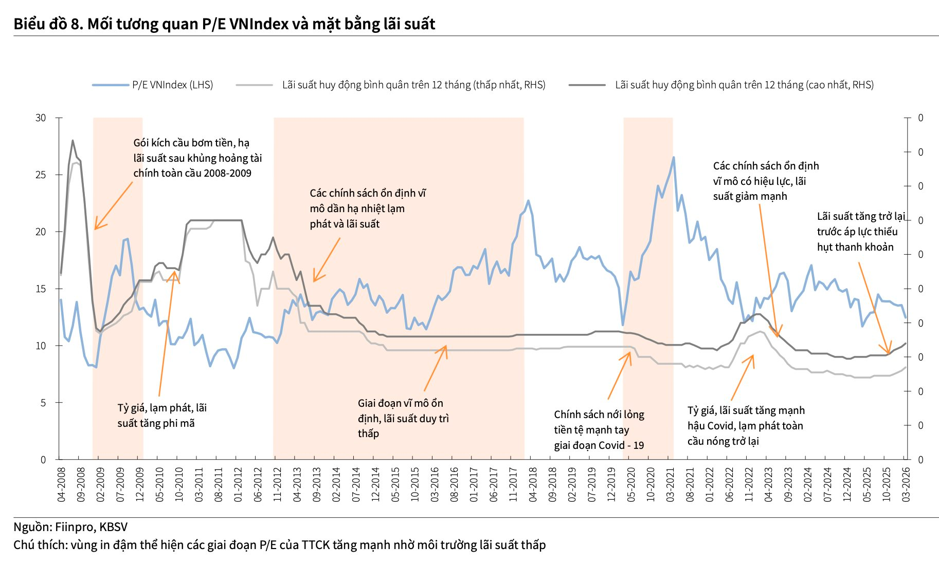 Trong nước, để hiện thực hóa mục tiêu tăng trưởng GDP khoảng 10%, chính sách tài khóa được kỳ vọng sẽ đóng vai trò chủ lực, trong khi chính sách tiền tệ đối mặt với áp lực lớn hơn trong việc vừa ổn định vĩ mô, vừa hỗ trợ thanh khoản hệ thống ngân hàng. KBSV cho rằng mặt bằng lãi suất huy động có thể tiếp tục tăng thêm 0,5–1% từ cuối quý I, duy trì ở mức cao trong quý II trước khi bắt đầu hạ nhiệt rõ rệt từ đầu quý III, khi các áp lực bên ngoài dần được giải tỏa.