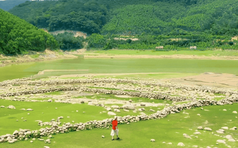 Có một bí mật mà không phải dân du lịch nào cũng rành rẽ, đó là khi mùa hè gõ cửa, dòng nước có phần vơi đi lại là lúc Suối Mỡ khoác lên mình một tấm áo hoàn toàn khác biệt. Lòng hồ cạn nước lùi lại, nhường chỗ cho những bãi đá trầm mặc trồi lên, đan xen cùng thảm cỏ dại xanh mướt trải dài ngút ngát như một thảo nguyên thu nhỏ.