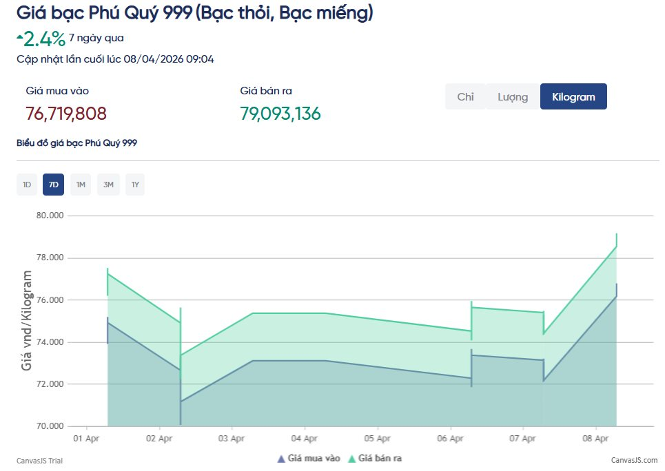 Tại thị trường trong nước, giá bạc cũng ghi nhận xu hướng tăng tương tự. Theo niêm yết của Tập đoàn Vàng bạc Đá quý Phú Quý, giá bạc Phú Quý 999 trong sáng ngày 8/4 được giao dịch ở mức khoảng 76,7 triệu đồng/kg chiều mua vào và 79,09 triệu đồng/kg chiều bán ra, tăng khoảng 4 triệu so với phiên ngày hôm qua. Đây là mức cao nhất trong vòng 3 tuần qua.