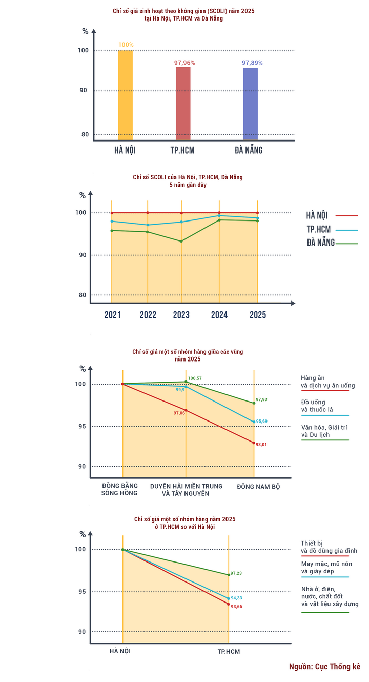 Theo số liệu của Cục Thống kê, so với 2 thành phố lớn khác là TP.HCM và Đà Nẵng, chỉ số giá sinh hoạt ở Hà Nội cao hơn với hầu hết các khoản thiết yếu. Cụ thể, giá thiết bị và đồ dùng gia đình ở TP.HCM bằng 93,66% so với Hà Nội; may mặc, mũ nón và giày dép bằng 94,33%; nhà ở, điện, nước, chất đốt và vật liệu xây dựng bằng 97,23%.