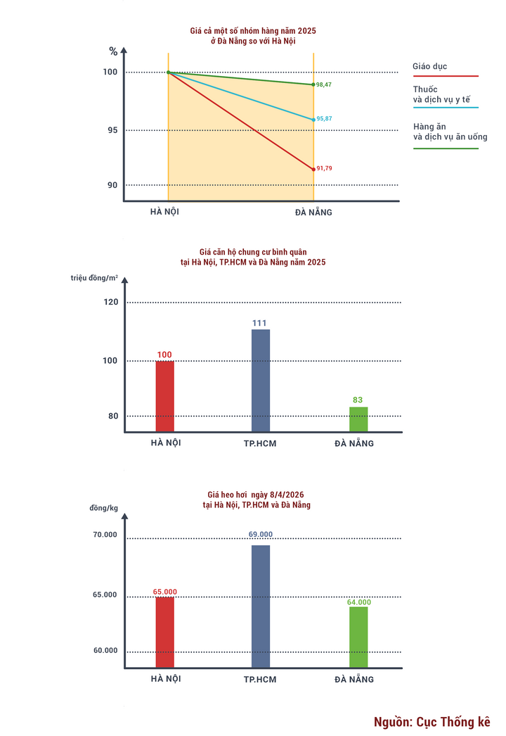 Tương tự, chi phí giáo dục ở Đà Nẵng chỉ bằng 91,79% so với Hà Nội; giá thuốc và dịch vụ y tế bằng 95,87%; giá hàng ăn và dịch vụ ăn uống bằng 98,47%.